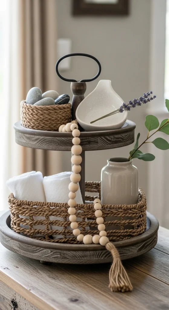 Wood beads add movement and texture. Drape them loosely rather than coiling tightly. Let some hang over the edge for flow. Place heavier bead strands on the bottom tier. Movement keeps the tray from feeling stiff. Pair beads with simple ceramics so textures don’t compete. Small vases work better than large ones. Greenery should stay minimal. One stem per tier is enough. For budget options, DIY bead garlands using unfinished wood beads and jute string. Light sanding removes factory shine. This tray fits entry tables, dressers, or shelves. It also works year-round. Seasonal changes can be as small as swapping bead color or adding a charm. Avoid mixing too many bead sizes. Consistency keeps the look calm. If the tray feels empty, add a wood riser instead of another object. This setup feels relaxed and handmade, which suits farmhouse spaces well.