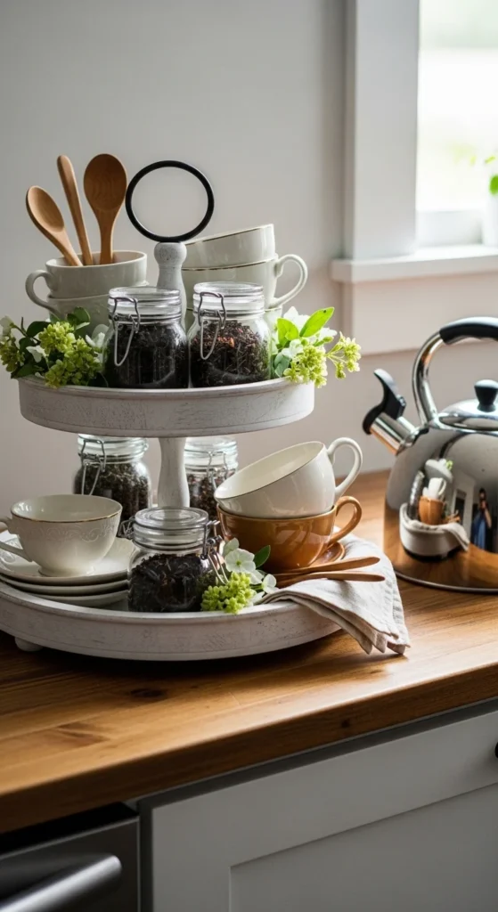 A tea tray feels softer than a coffee setup. Use teacups instead of mugs for a lighter look. Place them on the bottom tier for balance. Glass jars show tea blends and add visual interest. Clear containers keep the tray airy. Wooden spoons add warmth and texture. Florals should stay light and simple. Dried stems work well and don’t require upkeep. For budget options, mismatched teacups work if colors stay similar. Thrift stores are ideal for this. Keep the top tier uncluttered so the tray doesn’t feel busy. This setup fits kitchens, breakfast nooks, or sideboards. It also works well in small apartments where counter space matters. Seasonal swaps can include different tea blends or cup styles. The tray stays functional while still feeling styled. This look photographs well because glass and ceramic catch light softly.