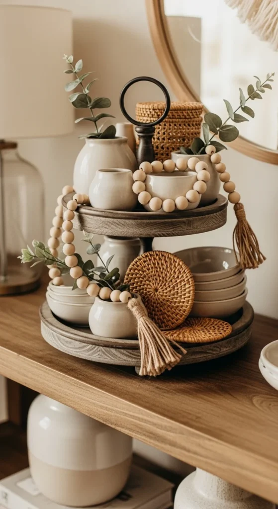 This tray blends decor with daily use. Start with small baskets or bowls to hold keys or sunglasses. Place functional items on the lower tier for easy access. Decorative pieces belong on top. Function guides placement here. Wood beads soften the structure and add movement. Keep greenery minimal so items stay easy to grab. This tray works best in narrow entryways where surfaces are limited. For budget options, use thrifted bowls or small woven containers. Matching colors matter more than matching styles. If everything shares a neutral palette, the tray feels cohesive. Avoid tall items that block reach. Height should stay moderate. Seasonal updates are simple. Add a small seasonal accent without removing the functional pieces. This setup helps keep clutter contained while still looking intentional. It suits busy households where decor has to earn its place. The tray feels lived-in, not staged, which makes it more inviting.