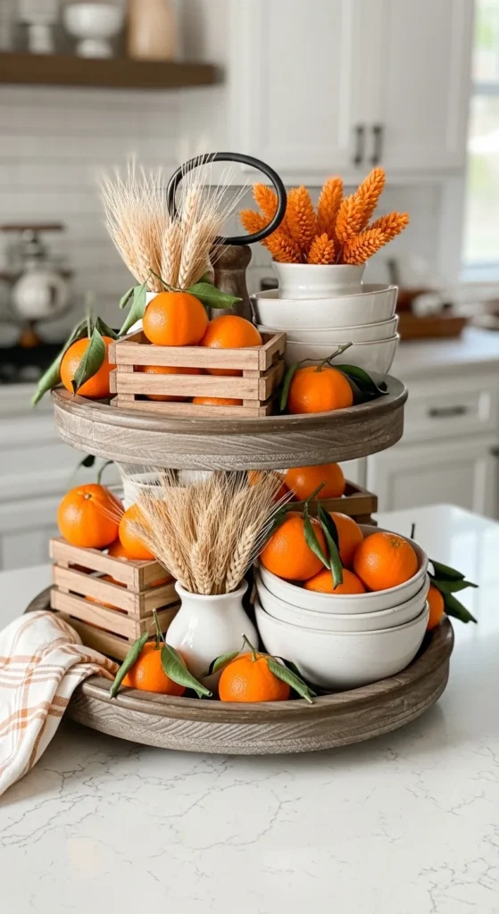 This tray brings fall color without feeling overdone. Start with mini oranges as the focal point. Place them in clusters of three or five for balance. Use small wooden crates or risers to add height and structure. Layering items creates visual interest and prevents the tray from looking flat. Dried wheat stems add texture and seasonal charm. Neutral ceramic bowls balance the bright orange tones. For budget-friendly options, faux oranges or small craft pumpkins work just as well. Arrange them in groups rather than scattering them, which keeps the tray intentional. This setup works best on kitchen counters, islands, or dining sideboards. Avoid placing fragile items near edges. Swap seasonal elements easily by switching oranges for apples in late fall or adding pinecones for early winter. Keep neutral items like bowls and crates year-round. This tray photographs beautifully because the mix of textures and muted colors allows the oranges to pop without overwhelming the scene.