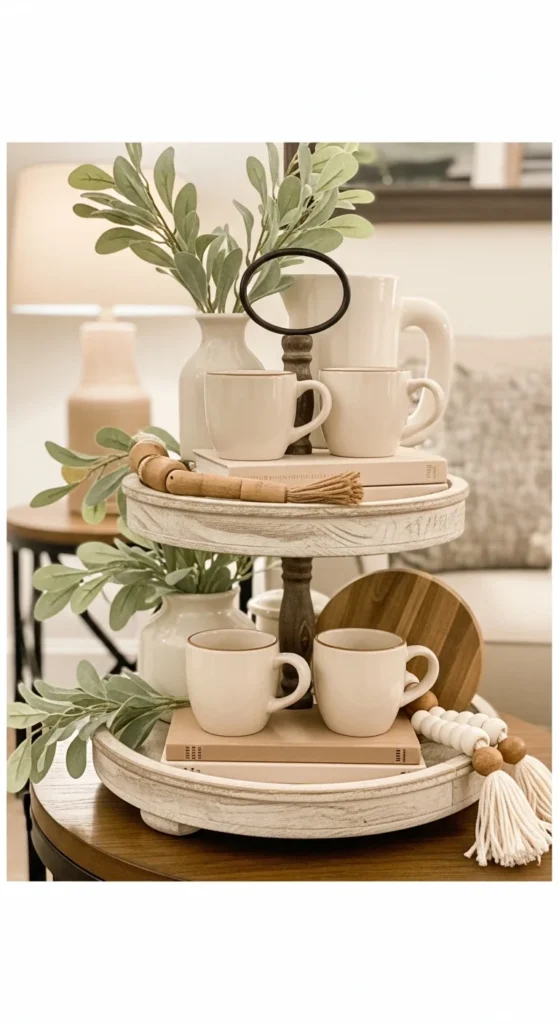 This tray combines function and charm. Use coffee mugs on the bottom tier for stability, then layer neutral books or journals on the top tier. Layering creates height and visual interest. Wooden accents like small trays or blocks soften the scene. Greenery should be light to avoid crowding. This setup is perfect for living rooms, reading nooks, or kitchens. Budget options include thrifted mugs, small hardcover books, or DIY wooden risers. Avoid adding too many small items that make the tray look cluttered. Keep base pieces neutral so seasonal swaps are easy. Swap mugs or books for seasonal colors or small decor items. This tray feels lived-in but intentional, perfect for casual homes. It also photographs well because neutral tones and layered heights create depth without heavy colors.