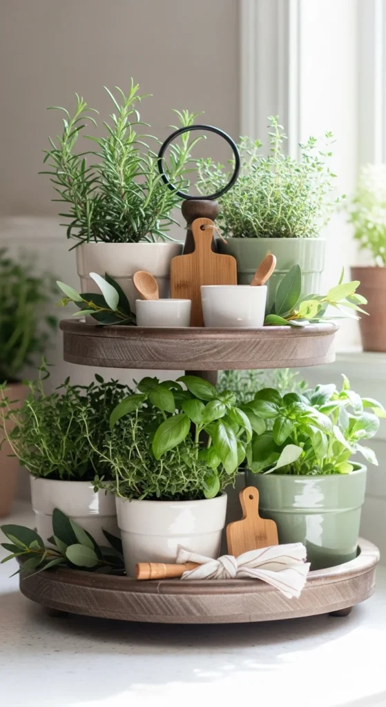 Herb trays combine decor with function. Use small potted herbs like rosemary, thyme, or basil. Place them in ceramic pots for a farmhouse feel. Wood accents like risers or small cutting boards help add height and texture. Functional items can also be decorative. Keep greenery minimal to avoid overcrowding. This tray works in kitchens, on islands, or near windows. For budget builds, repurpose small planters or thrifted pots. Odd numbers of herbs or pots look natural and balanced. Rotate herbs as needed to keep them fresh. Avoid overcrowding so each plant has breathing room. Seasonal swaps can include different herbs or small dried floral accents. This tray also photographs well because the greenery brings life, and textures like wood and ceramic create visual depth.