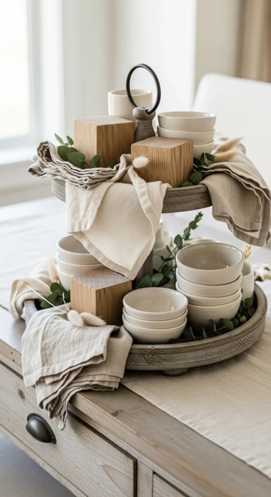 This tray focuses on texture instead of color. Linen does most of the visual work. Fold napkins casually rather than sharply. Soft edges make the tray feel relaxed. Stack wood blocks or books to build height. Keep taller items toward the back of each tier. Height variation keeps the tray from feeling flat. Clay or ceramic bowls add weight and balance. Matte finishes work better than glossy ones here. Stick to one greenery element so the tray stays calm. Olive stems or soft eucalyptus fit well. For budget-friendly options, use thrifted tea towels instead of linen. Light sanding on wooden pieces removes shine and adds character. This tray fits dining rooms, entry tables, or kitchen islands where bold decor would feel distracting. If the look feels too pale, add one darker accent like a charcoal bead strand or a single dark wood piece. Just one is enough. Seasonal updates should stay subtle. Add a mini pumpkin in fall or dried florals in winter. Avoid bright seasonal colors. The goal is continuity. This setup works well for people who prefer clean spaces but still want warmth. It also performs well in photos because shadows and textures show clearly without heavy contrast.