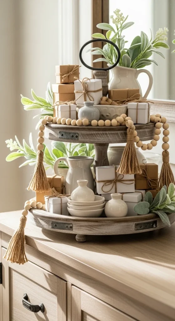 Gift trays are functional and stylish. Start with small neutral gift boxes on the bottom tier. Layer neutral ceramics and wood beads on the upper tiers. Keep the palette cohesive so the tray feels intentional. Greenery should stay subtle and soft. This tray works as a gift display, a welcoming setup for guests, or for housewarming events. Budget options include DIY gift boxes, thrifted ceramics, or faux greenery. Odd numbers of items create a natural feel, and height variation keeps the tray dynamic. Avoid overcrowding the tiers. Seasonal swaps can include different small gifts or decorations. This setup feels curated but approachable. It also photographs well for social media or Pinterest because neutral tones and layered heights create depth and interest without overwhelming the eye.
