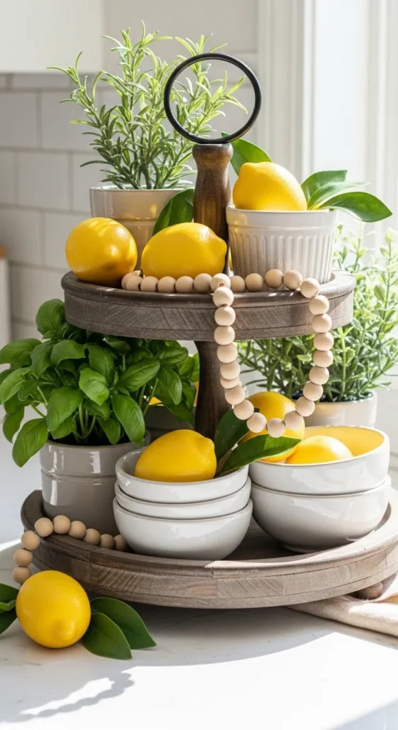 This summer tray celebrates light and color without feeling overwhelming. Start with a neutral base of white or cream ceramic bowls to anchor the design. Place faux lemons in clusters to bring vibrant pops of yellow, but keep them balanced with greenery to prevent color overload. Odd numbers of lemons and pots create a natural, relaxed look. Small potted herbs like basil, thyme, or rosemary add texture, depth, and a hint of practical charm. Wood beads or small wooden risers add subtle height variation, which keeps the eye moving across the tiers. Budget-friendly options include faux lemons from craft stores or small thrifted herb pots that can be painted or customized. Arrange taller elements toward the back of each tier to maintain visibility of all items. Avoid overcrowding; leave negative space to keep the tray airy. This tray works perfectly on kitchen counters, breakfast nooks, or open shelving where sunlight enhances the colors. Seasonal swaps are easy—swap lemons for oranges in fall, or add pastel florals in spring. The base neutral pieces remain, which saves storage and makes styling easier. This setup also photographs beautifully for Pinterest because the vibrant yellow contrasts against soft greens and whites, creating a fresh and inviting visual that feels both practical and decorative.
