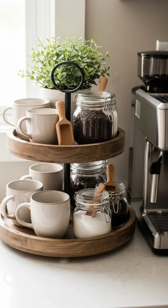 A coffee bar tray should look good and work well. Start with mugs on the bottom tier. They add weight and keep the tray steady. Choose neutral mugs so the tray doesn’t clash with appliances. Glass jars hold sugar, pods, or stirrers and keep the setup tidy. Wood scoops add warmth and texture. Function and style should share space here. Avoid overdecorating the top tier. One small plant or sign is enough. If counter space is tight, use a narrow two-tier tray instead of a wide one. For budget options, mismatched mugs work fine if the colors stay consistent. Thrift stores are great for glass jars. Skip labels if the tray already feels busy. This setup changes easily throughout the year. Swap mug designs or jar contents instead of rebuilding the whole tray. Keep greenery minimal so cleaning stays easy. This tray works best when it feels lived-in, not staged. It also performs well in photos because the items are familiar and relatable. A practical tray often feels more personal than a purely decorative one.