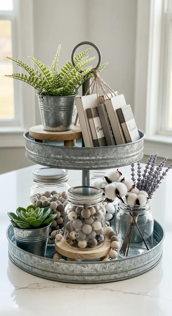 Galvanized metal brings contrast without overpowering the tray. Start with metal planters or buckets as focal pieces. Pair them with light wood to soften the look. Balance keeps metal from feeling cold. Glass jars help reflect light and keep the tray airy. Fill them with beads, dried stems, or small tools. Signs should stay small and simple. One sign per tray is enough. Too many words can feel cluttered. For a budget-friendly option, spray paint plastic planters with a galvanized finish. Light sanding adds texture and makes them look more realistic. This tray fits modern farmhouse kitchens, entry tables, and open shelving. It pairs well with white walls and neutral counters. Seasonal updates are simple. Add greenery in spring. Use dried wheat in fall. Add pinecones in winter. Keep the metal pieces year-round as your anchor items. This setup works well for people who like a slightly industrial edge but still want warmth. It also photographs well because the mix of matte and reflective surfaces adds depth without heavy color.