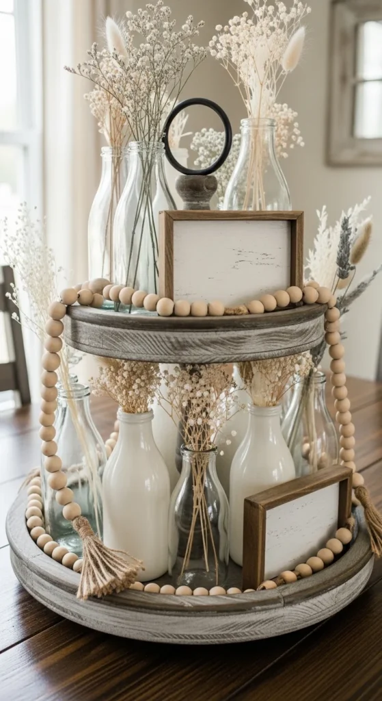 Milk bottles bring instant farmhouse character. Use clear or frosted glass for a softer look. Avoid bright labels or bold text. Place bottles in pairs or trios rather than spreading them out. Grouping glass keeps the tray cohesive. Dried florals work better than faux here. Pampas, bunny tails, or wheat add softness without visual noise. Wood beads help break up the glass and add warmth. Signs should stay minimal and small. One simple phrase is enough. For budget builds, thrift stores are the best source for bottles. Slight variations in shape add charm. This tray fits dining rooms, kitchen nooks, or sideboards. If the tray feels too delicate, add a wood block or small crate piece for balance. Seasonal changes are subtle. Swap florals instead of bottles. Use cotton stems in winter or lavender in spring. This setup feels collected over time rather than styled all at once. It also photographs beautifully because glass catches light without overpowering the scene.