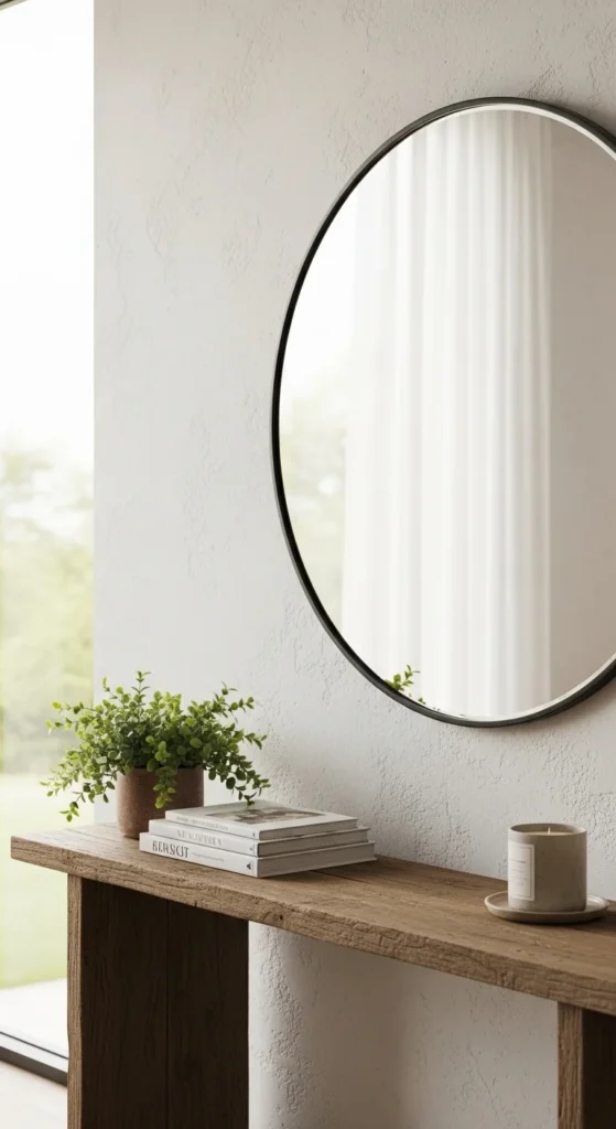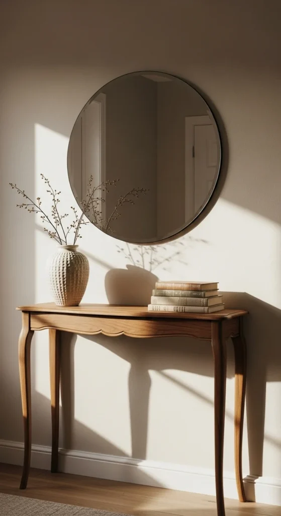 A round mirror creates immediate visual softness at the entrance. It reflects light, making the space feel open and welcoming. Choose a size that fills at least one-third of the wall above the console table to avoid looking too small. A thin frame feels modern while still warm. If the entrance is dark, position the mirror opposite a window or lamp to reflect brightness. Hang it slightly lower than expected so it meets eye level—this creates comfort. If you want to add personality, choose a mirror with a brass or wood frame. This is one of the simplest high-impact entry styling tricks and doesn’t require rearranging the entire room.