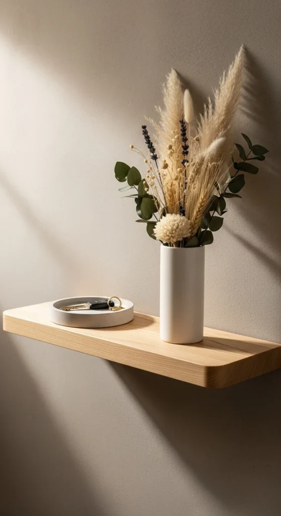 A floating shelf works when there’s no room for a console table. Choose a wood tone that matches or complements your flooring. Add only one or two small items on top—a tray for keys and a small vase. This keeps the entry functional but visually calm. Secure the shelf well if placing anything heavier.