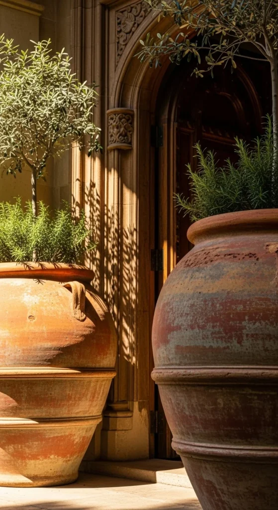 Planters help define the entry. Terracotta brings warmth and a relaxed, grounded feel. Place one planter on each side of the door for balance. Fill with rosemary, bay laurel, or any slow-growing shrub. Keep shapes simple. If caring for live plants is challenging, choose hardy foliage or preserved greenery.