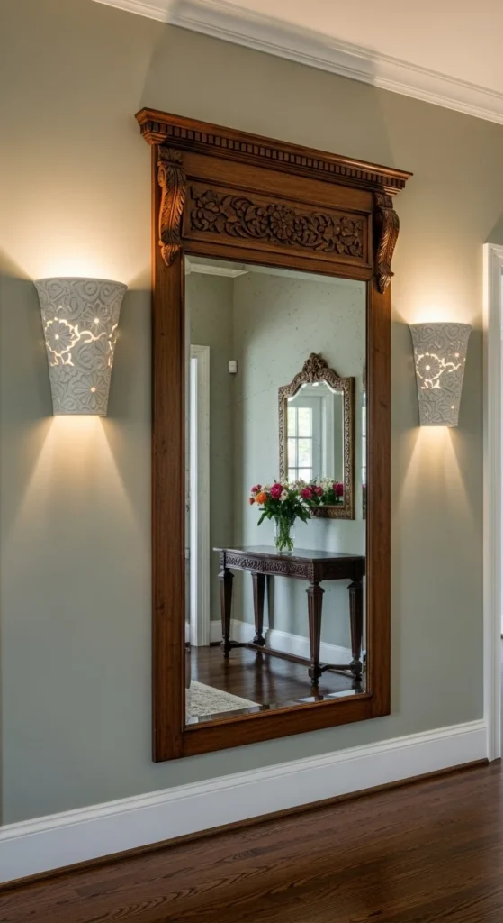 A leaning mirror adds a graceful sense of openness. It reflects surrounding light and makes small entries feel airy. Choose a frame that harmonizes with your door or flooring. Leaning the mirror rather than mounting it gives the space a relaxed feel. Add a small plant or stool beside the mirror to complete the composition. If you’re concerned about tipping, secure the top with a discreet wall anchor. A full-height mirror also gives you a place for quick outfit checks before stepping out.