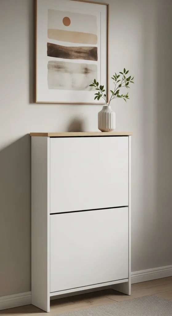 A shoe cabinet clears floor clutter quickly. Choose one that sits low and slim so the entry doesn’t feel crowded. Keep only daily shoes stored here to avoid overflowing. Place a single object on top—a book, candle, or vase—to keep the styling clean.