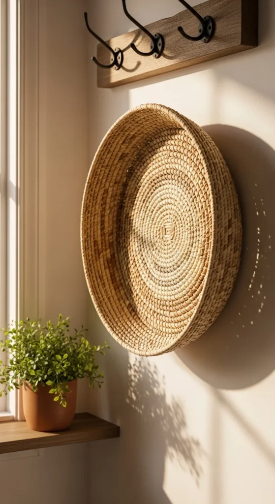 A woven wall basket offers subtle texture and a handcrafted mood. Place it slightly off-center near the mirror or hooks to create flow. You can also use it to hold mail in a soft, natural way. Choose one basket rather than many to avoid visual clutter.