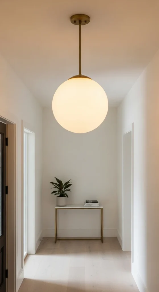 A pendant can define the entrance instantly. Choose a shape with gentle curves—globes and domes are timeless. Keep the lighting warm rather than bright to create a welcoming tone. If the ceiling is low, choose a semi-flush mount instead. A pendant marks the entry as a meaningful part of the home.