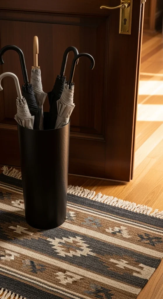 A slim stand keeps umbrellas neatly contained. Choose one with open sides so water evaporates. Position it near the door but not blocking foot traffic. If budget-conscious, repurpose a tall ceramic vase or metal basket. Keep only one or two umbrellas visible to maintain tidy visual lines.