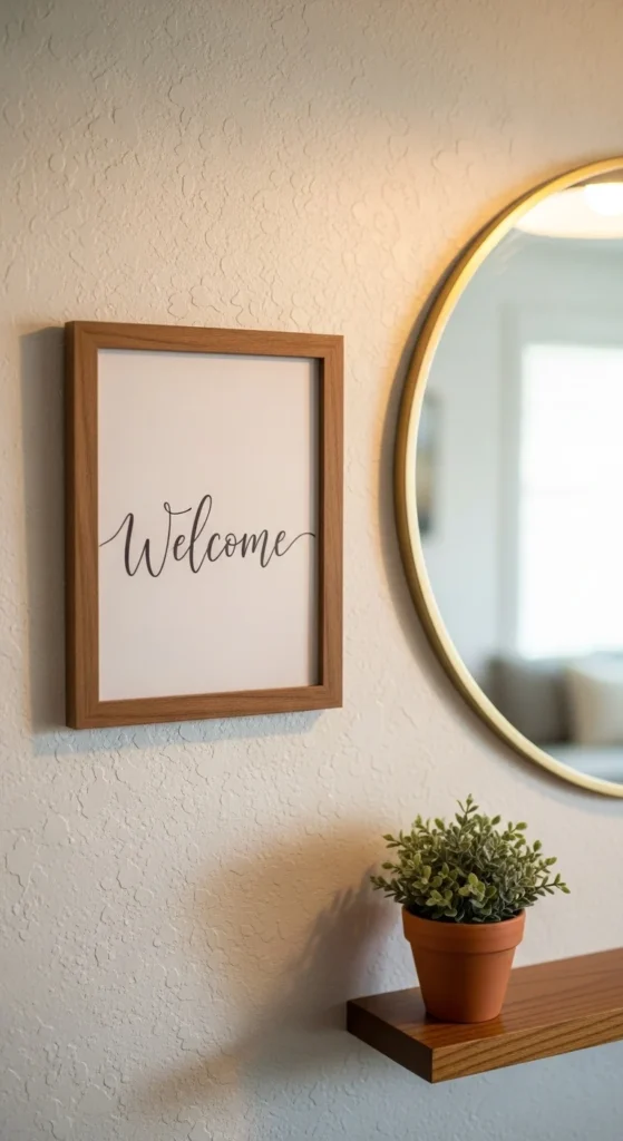 A small framed word can add gentle warmth without overwhelming the space. Keep typography light and peaceful. Choose a frame that matches the tones already present. Hang the frame at eye level and avoid surrounding it with too many other pieces to keep the entry calm and intentional.