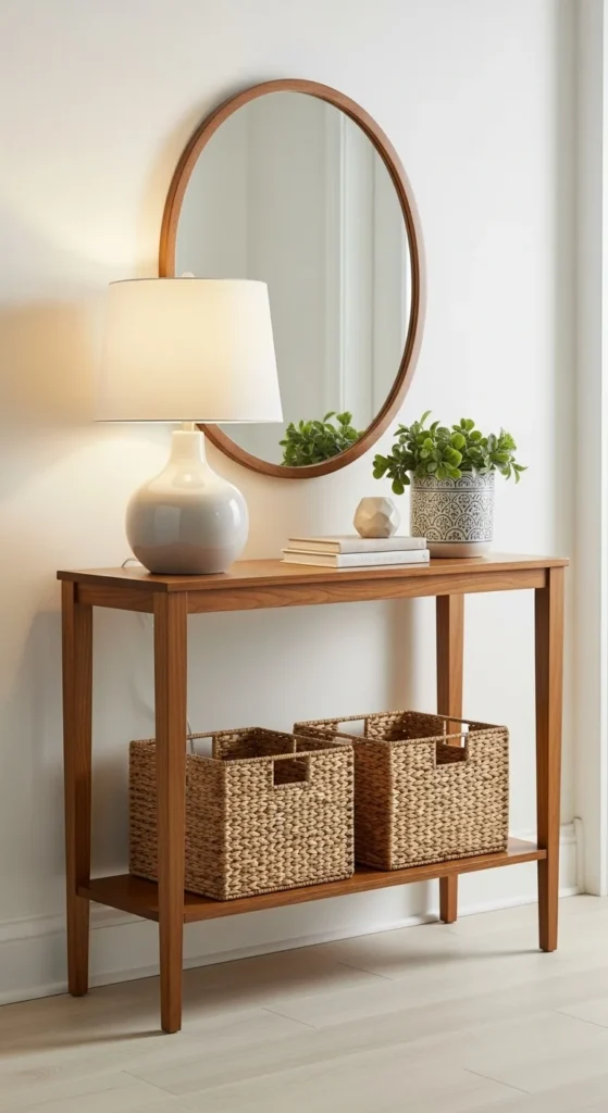 A narrow console with a built-in lower shelf is helpful for keeping the entrance structured and welcoming. The lower shelf is a natural spot to place baskets for gloves, scarves, small bags, or anything used daily. Keep the baskets unified in color or material so the space stays calm to the eye. On the tabletop, choose just two or three items: a lamp for warm light, a plant for softness, and one personal object like a framed photo or a carved bowl. This combination keeps the entrance thoughtful without overdoing detail. If you’re limited on room, choose a console depth of about 12 inches so foot traffic isn’t interrupted. For a DIY upgrade, refinish the console in a soft matte finish to coordinate with flooring and door trim.