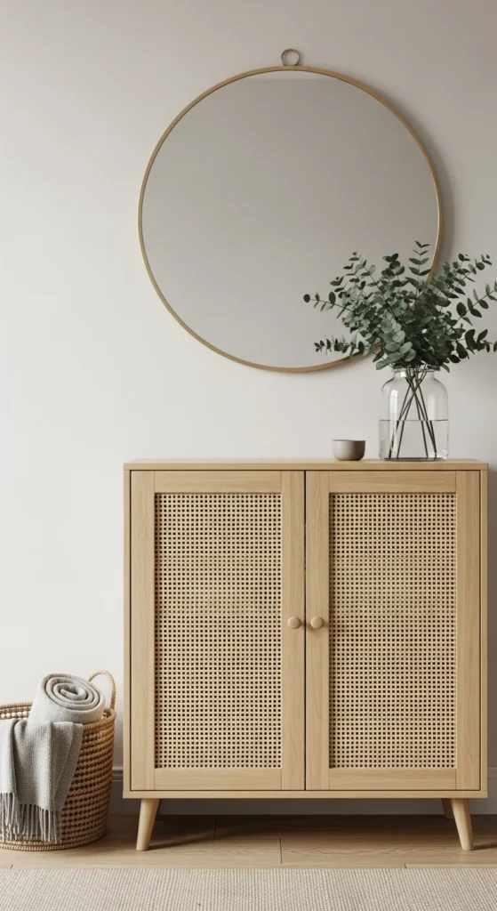 A cane-front cabinet adds texture and quiet character. It provides hidden storage which helps the entrance feel open even during busy days. Cane works with many styles—modern, traditional, or Scandinavian-inspired. Look for one that is waist-high so it doesn’t feel blocky. Inside, store seasonal accessories or mail that hasn’t been sorted yet. Place a mirror above it for balance and add a plant or vase for height. If buying new furniture isn’t the plan, you can also apply peel-and-stick cane mesh to doors of an existing cabinet. Keep the palette around it neutral to allow the cane texture to speak softly.