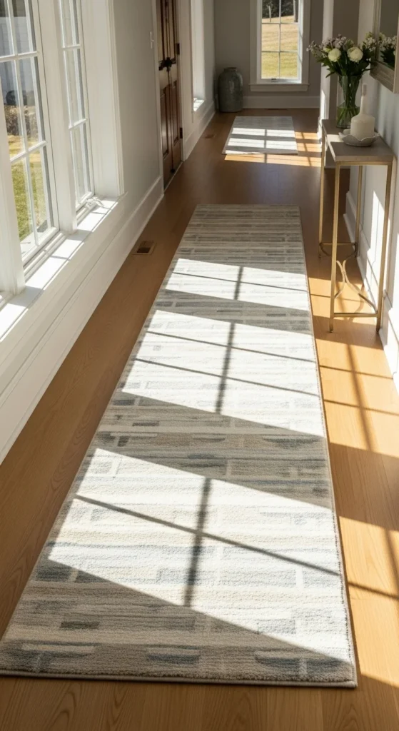 A runner guides the eye deeper into the home and helps define the entry path. Choose muted patterns so the walkway doesn’t feel busy. Look for rugs with a low pile for easy cleaning. If your hallway is narrow, measure the runner so it leaves a small border of visible flooring on each side—this helps the space feel balanced. Runners also reduce echo in long hallways and make entry movement feel comfortable. For budget options, cotton-woven runners are washable and long-lasting.