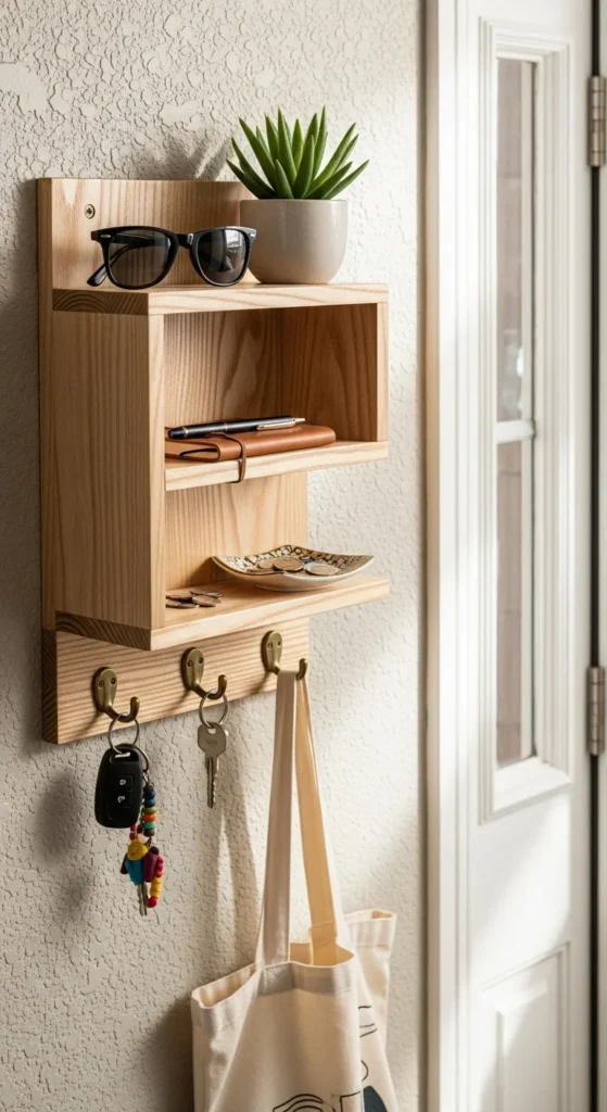 Organizer ledges are simple and helpful in everyday routines. Choose one with both hooks and a flat surface so items like sunglasses, keys, and mail have a designated place. Install it at chest-height so everything is accessible without bending. Keep only frequently used items on it—this prevents visual clutter. If you enjoy seasonal styling, place a tiny vase with dried flowers or greenery on the ledge. A ledge also works well in small apartments where floor furniture isn’t possible.