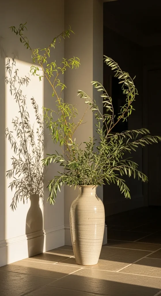 Branches add sculptural height without feeling complicated. They make the entrance more expressive without overwhelming the space. Choose long, relaxed stems rather than tight florals. Willow, magnolia, and olive branches work beautifully. Replace them occasionally if using fresh ones, or use preserved stems for longer stability. A statement vase can be thrifted—focus on shape first, color second. This arrangement works well in corners or next to a bench.