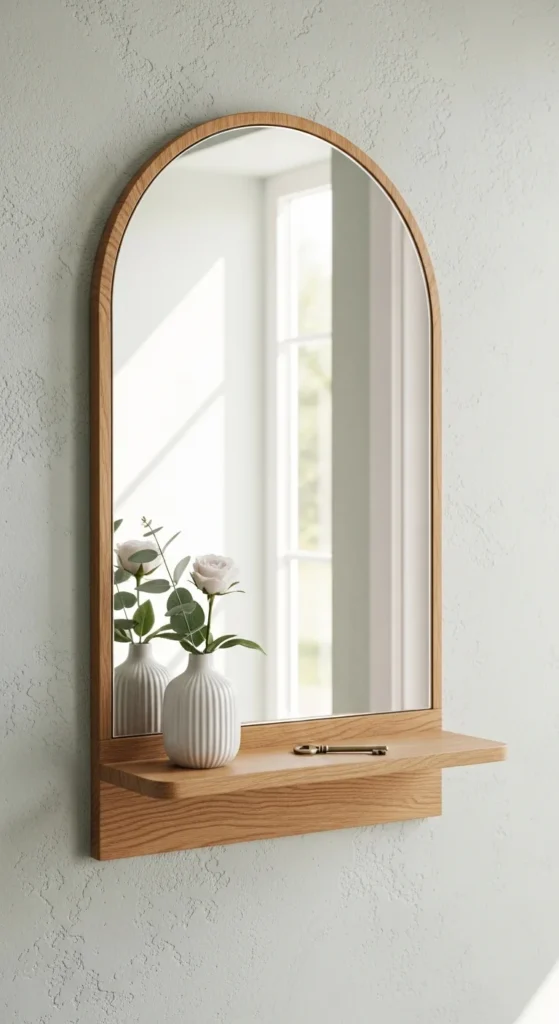 An arched mirror with an integrated shelf saves space and adds visual softness. The gentle curve of the arch draws attention without calling for many additional decor pieces. The small shelf can hold one object like a small plant or a carved stone. Choose this setup if your entry is particularly small and needs both function and calm styling. Keep the surroundings minimal to allow the arch to stand out.