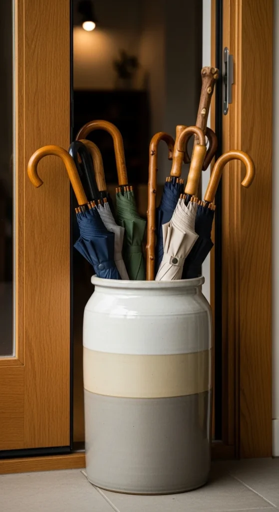 A ceramic crock feels timeless. It also keeps umbrellas organized without appearing busy. Choose one wide enough so umbrellas fit comfortably without leaning awkwardly. Look for neutral glazes—off-white, clay, or sand. If you enjoy subtle handmade details, search for crocks with slight texture or naturally varied glaze patterns. Place it close to but not directly in the walkway to avoid blocking movement.