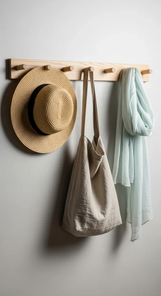 A peg rail is both functional and charming. It works well in narrow spaces and looks intentional even when in use. Choose a rail length that fits most of the entry wall to create a strong visual line. Hang simple items—one or two pieces per section. Too many items can overwhelm the look. Peg rails also offer flexible use during different seasons, making them practical for everyday living.