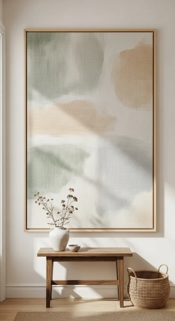 Framed fabric adds texture without requiring many objects. Choose fabric with small, calm patterns—botanical prints, faded geometrics, or simple linen with visible weave. This approach softens the entry while keeping it simple. You can DIY this easily by stretching fabric over a frame or securing it behind a large picture frame. It’s also affordable and easy to switch out when you want a new mood.