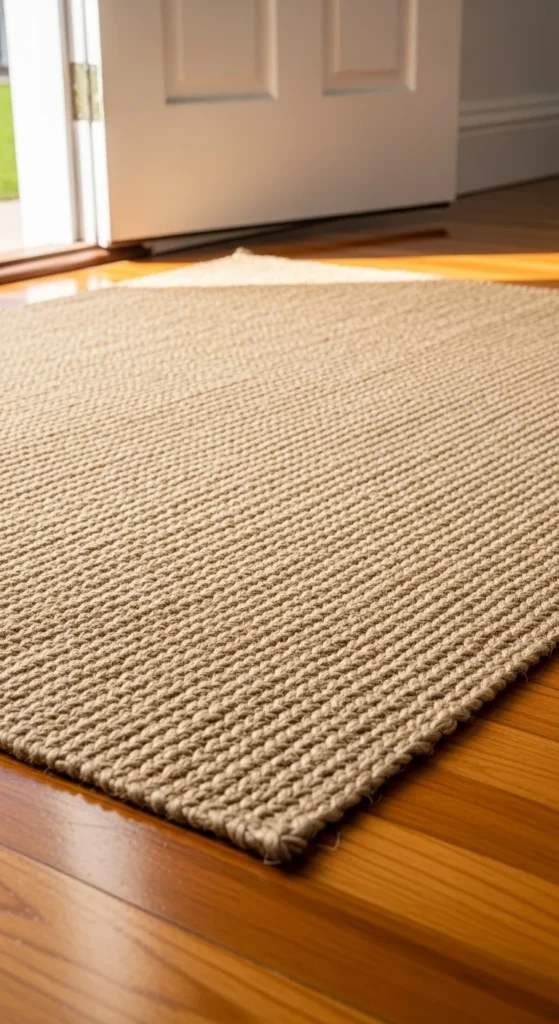 A woven rug brings texture right at the entry. Jute or sisal rugs are durable, especially in high-traffic areas. Choose a size that extends beyond the door path rather than a tiny mat—that helps the space feel connected to the rest of the home. If your flooring is dark, a warm sand-toned rug brightens it. Shake it out weekly to keep dust away. Layering a soft cotton runner on top adds extra coziness. For smaller homes or apartments, a runner works beautifully to guide the eye inward. A woven rug instantly makes the entrance feel intentional rather than just a pass-through area.