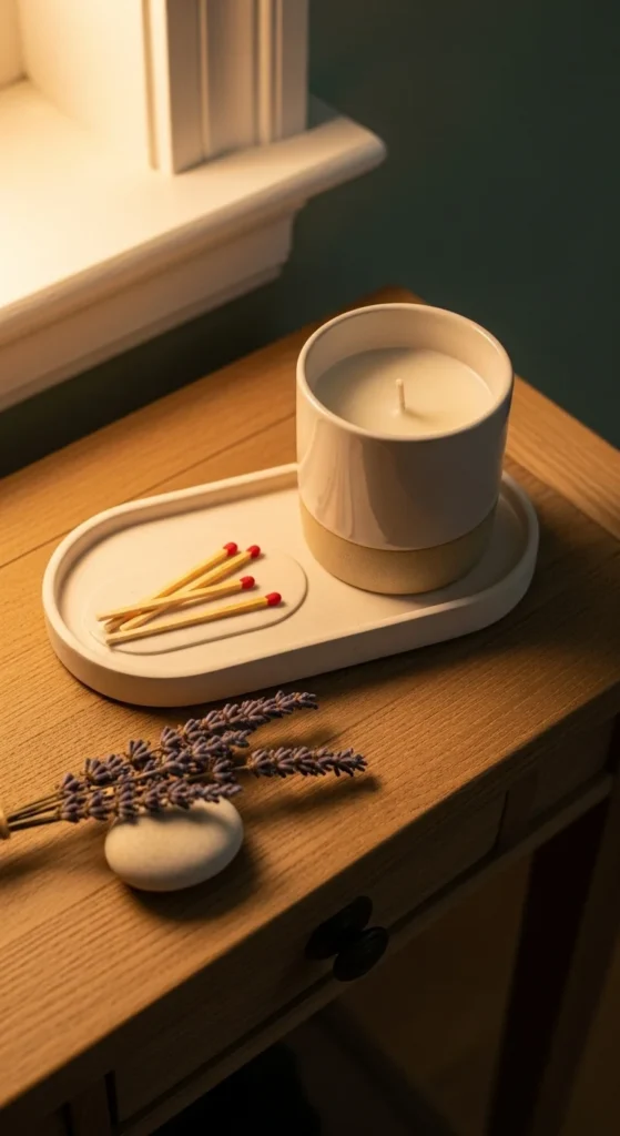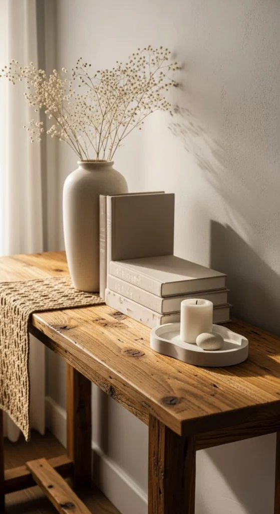 Lighting a soft candle near the entrance sets a calm and welcoming atmosphere. Choose natural scents like cedar, lavender, or linen if using fragrance, but keep it subtle. A small ceramic match holder adds charm and everyday beauty. Place the candle slightly off-center on your console table so it doesn’t compete with larger objects like a lamp or vase. The glow feels grounding in the evenings. Just remember to extinguish before leaving home.