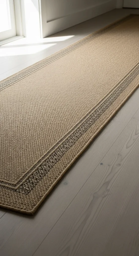 A runner with a border subtly defines the entry path. It gives structure without overwhelming the hallway. Choose calm tones that work with wall color and flooring. If your entry is long, choose a runner that stretches close to the doorway transition instead of a short rug. This visually extends the space.