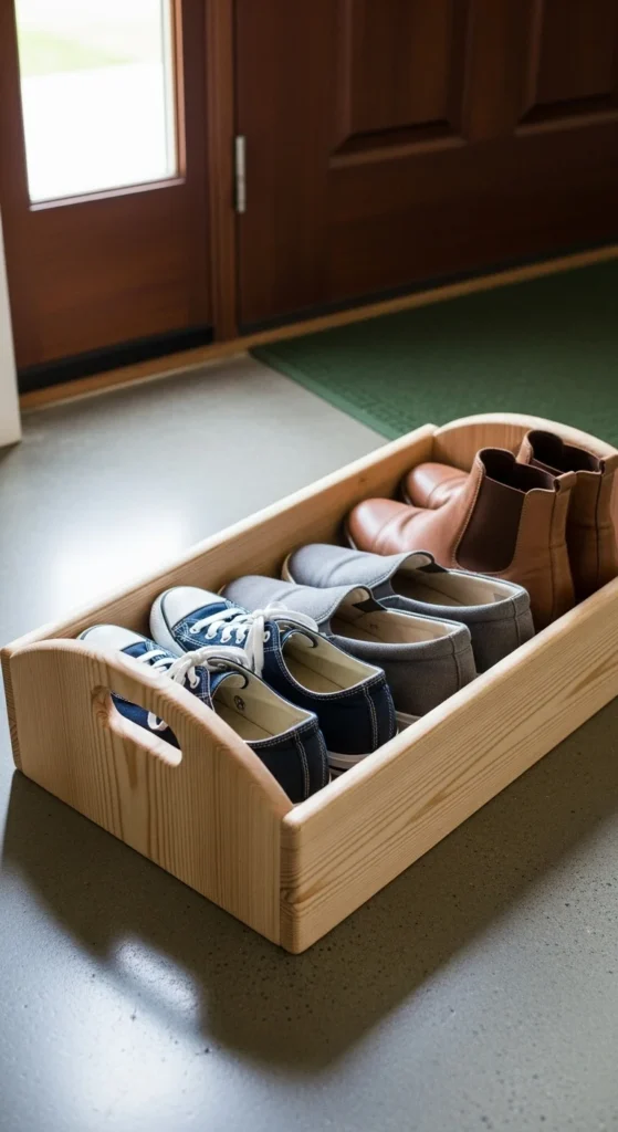 A small tray for shoes prevents dirt from spreading across the floor and keeps the entry tidy. Choose a tray with gently curved edges for a softer look. Keep only one or two pairs visible to maintain calmness. This works beautifully in both large and small spaces.