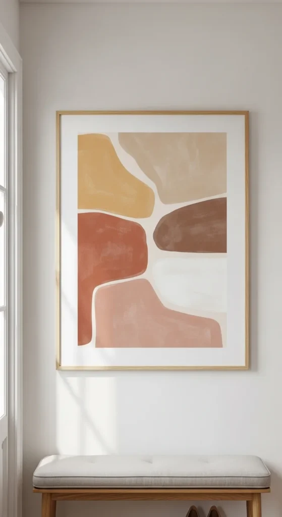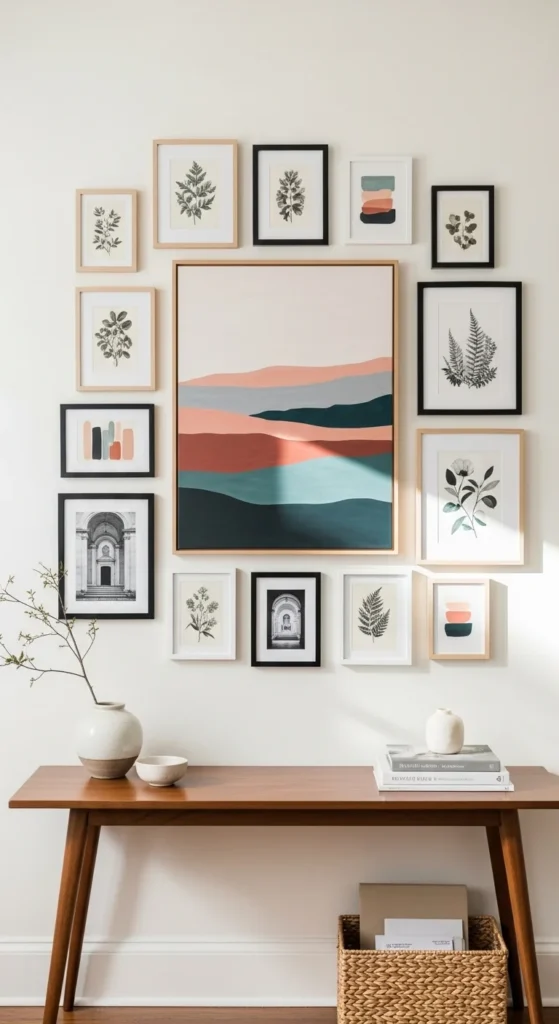 A layered art wall adds personality right away. Choose one larger piece as the anchor, then place smaller complementary artworks around it. Keep spacing consistent—use painter’s tape to plan placement first. Frames don’t need to match exactly; they just need to share a mood. Soft landscapes, abstract brushstrokes, or simple line drawings work well here. Keep the palette gentle so the entry remains calm.
