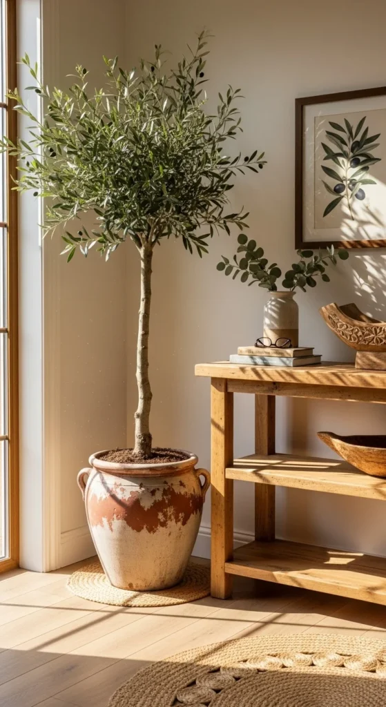 A tall indoor tree adds life and height. Olive trees, ficus, and fiddle leaf figs bring quiet greenery without overwhelming the space. Choose a planter that matches your entry’s tone—ceramic for softness, concrete for modern depth. Place the tree in a spot that doesn’t block walking flow. If natural light is limited, try a high-quality faux tree. To introduce personality, wrap the planter base in a woven basket to add warmth. Rotate the tree occasionally to keep the foliage balanced. A tree near the entry sets a welcoming mood instantly.