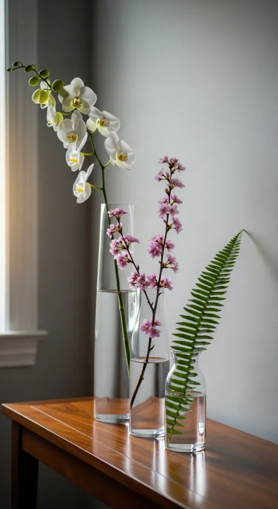 A trio of vases offers balance without clutter. Vary the height slightly for flow. Keep each vase holding just one stem or branch so the arrangement stays calm. Replace stems as needed to keep the look cared-for.