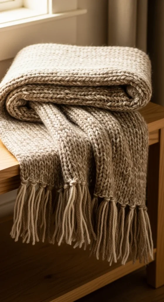 A throw adds softness to the entrance without requiring major styling. Choose wool, cotton, or a nubby weave for texture. Drape it loosely over one corner of the bench rather than folding it tightly—this keeps the look comfortable. Match its tone to the runner or rug for quiet harmony. This is also practical: guests arriving in cooler weather will appreciate something cozy to sit against.