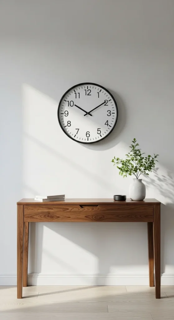 A simple wall clock is both beautiful and helpful in the entry. Choose one with clean lines and a calm face design. Avoid overly bold prints that might overwhelm the space. Hang it in a spot visible from the door—this makes timing smoother on busy mornings. If your entry has a round mirror, choose a clock that shares similar scale or tone to create visual flow.