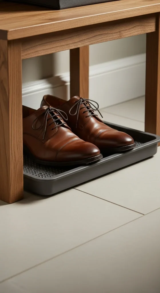 A shoe tray helps maintain tidy floors, especially in rainy seasons. The key is keeping only one or two pairs visible. For a minimal approach, choose a tray that blends into the floor rather than one with a bold pattern. Place it slightly under the bench so it feels integrated rather than separate. This is a useful strategy in both large foyers and small apartments.