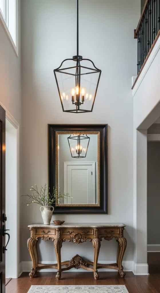A lantern pendant adds structure and charm overhead. It gives the entry a sense of intention the moment you walk through the door. Choose warm-toned bulbs to avoid harsh lighting. If ceilings are lower, choose a semi-flush lantern shape rather than a long drop pendant. Keep surrounding decor simple so the pendant can shine as a focal feature.