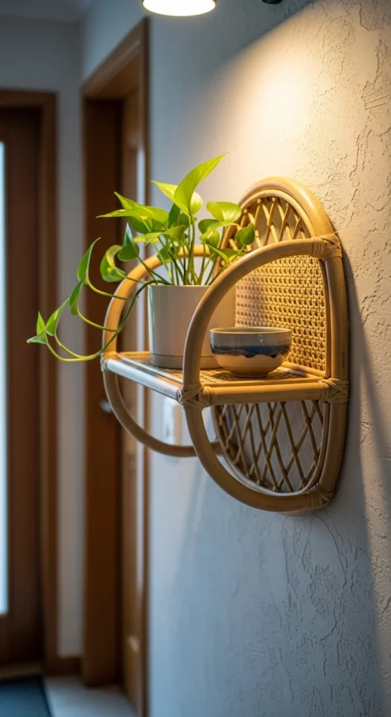 A rattan shelf adds a natural, relaxed moment in the entry. The texture catches light gently and pairs well with white or light-colored walls. Use it to hold lightweight items—keys, sunglasses, a small bud vase. Avoid overcrowding; just one or two items is enough. This is a great option for entries too narrow for larger furniture.