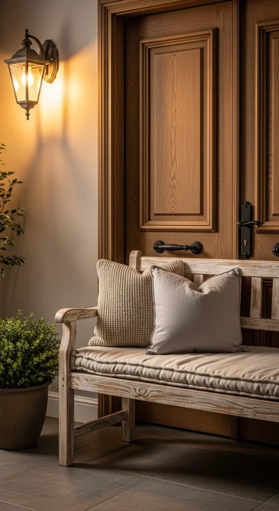 An entry bench offers comfort and function. It gives guests a place to put down bags or slip off shoes. Choose one that fits wall-to-wall if possible, which makes the space feel built-in and intentional. Linen cushions add softness without being too formal. If the bench feels plain, throw pillows in muted tones to add gentle interest. For DIY, repurpose an old bench and sand the wood to expose natural grain—then seal with matte finish oil. Keep the bench clear of clutter so it maintains calm energy.