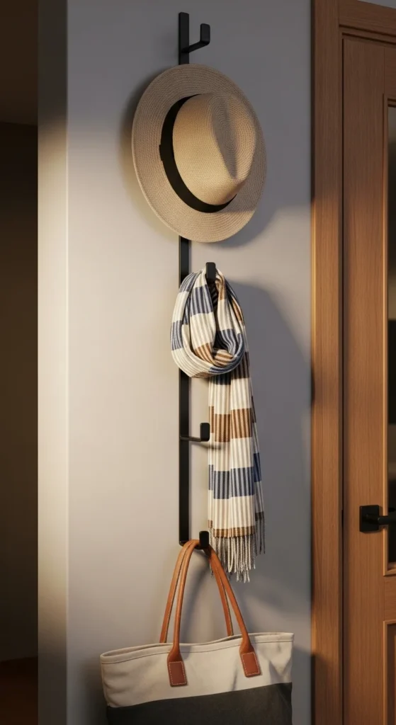 Vertical hooks save space and help the entry stay tidy. They work especially well for small hallways. Choose metal hooks if your space leans modern or wood pegs for a softer atmosphere. Keep what’s hung intentionally—one tote, one hat, one light jacket. Too many items cast visual noise. If you want to change seasonally, rotate colors on the hanging pieces. Vertical arrangement draws the eye upward, making the wall feel taller.