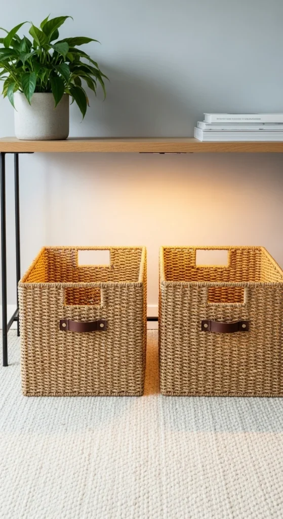 Baskets hide shoes, scarves, and everyday clutter while adding warmth. Choose baskets that fill the negative space below the console table. To keep the look cohesive, pick baskets in similar tones and materials. If you’d like to organize smaller items, add drawstring cotton bags inside each basket. This is an easy way to maintain visual calm without strict organization rules.