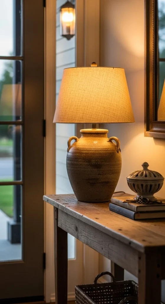 Soft lighting makes guests feel comfortable upon entering. A stoneware lamp with a linen shade creates a gentle glow. Place it on a console table and choose a warm bulb temperature (2700K works well). If outlets are limited, battery-operated table lamps are now high-quality and cordless. Turn the lamp on in the evening to welcome anyone walking through the door.