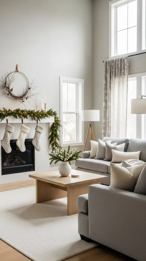 For each zone, add just 1–2 holiday layers—like garland, candles, or seasonal artwork—so the space still feels breathable and uncluttered.