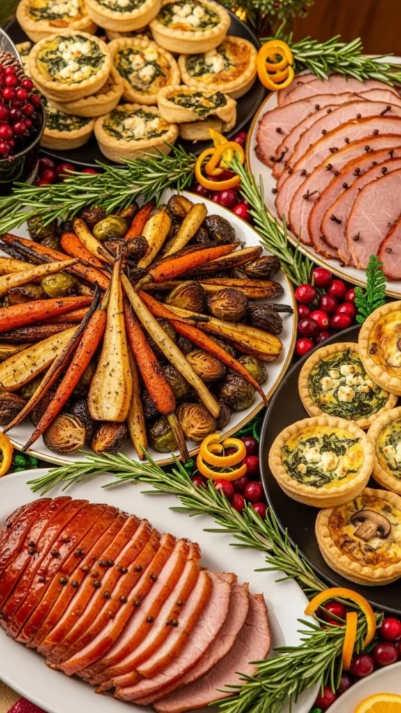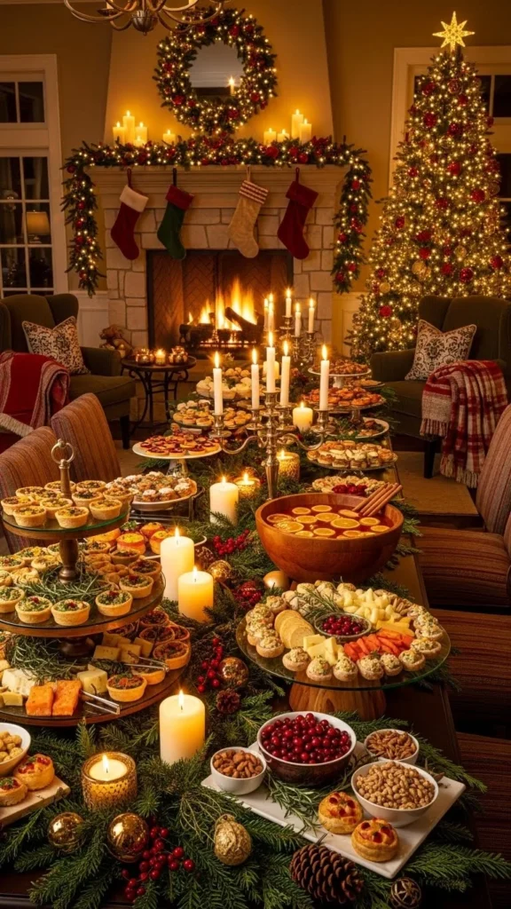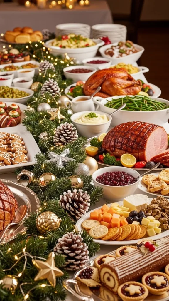 - A festive backdrop to frame the buffet (wreaths, garlands, or hanging stars)