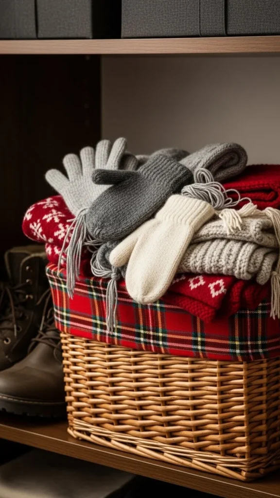 - A small bin labeled for guest gloves or scarves