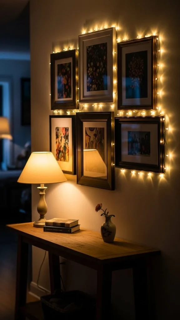 Lighting takes your gallery wall from pretty to Pinterest-perfect. Soft, warm lights enhance artwork and give the display a cozy glow.